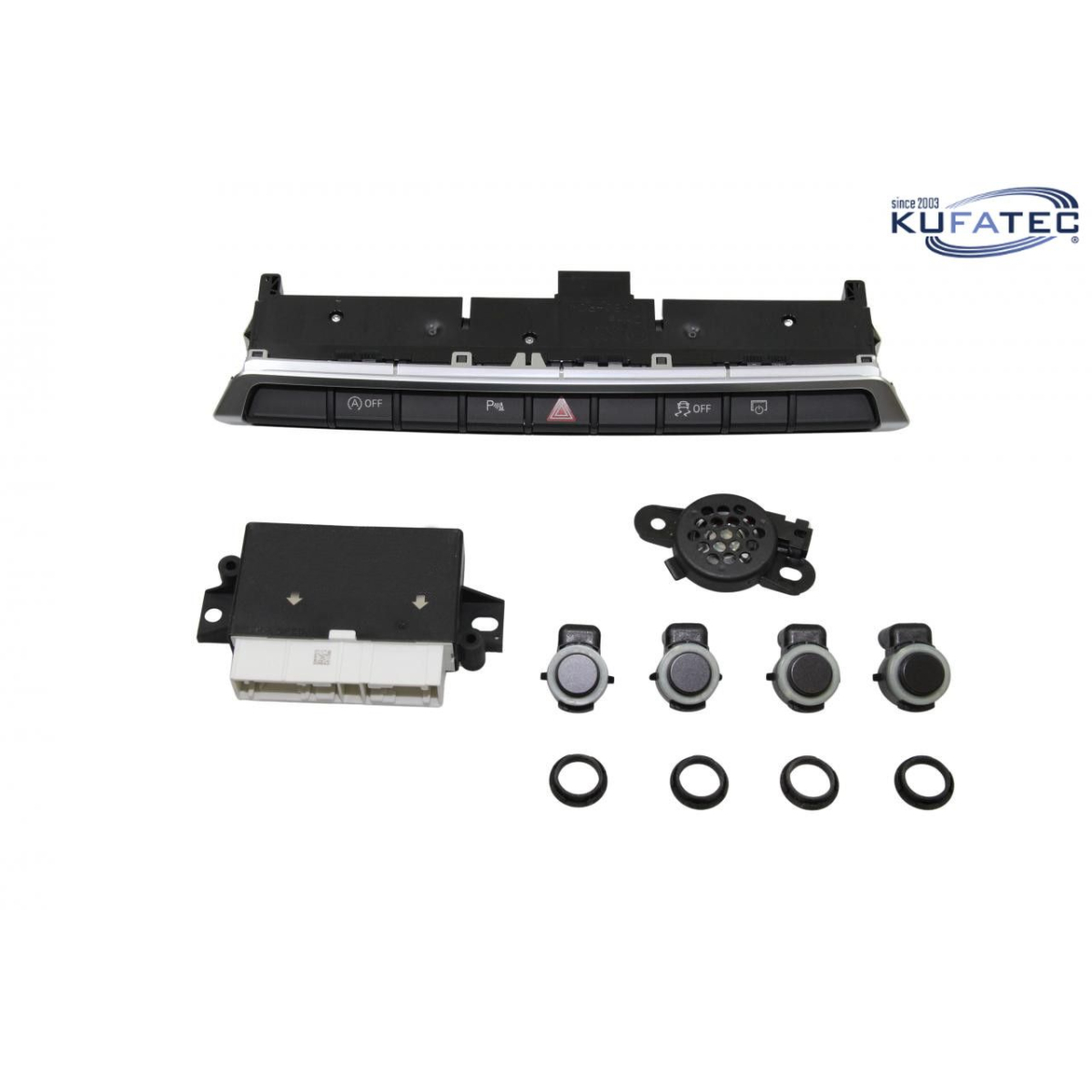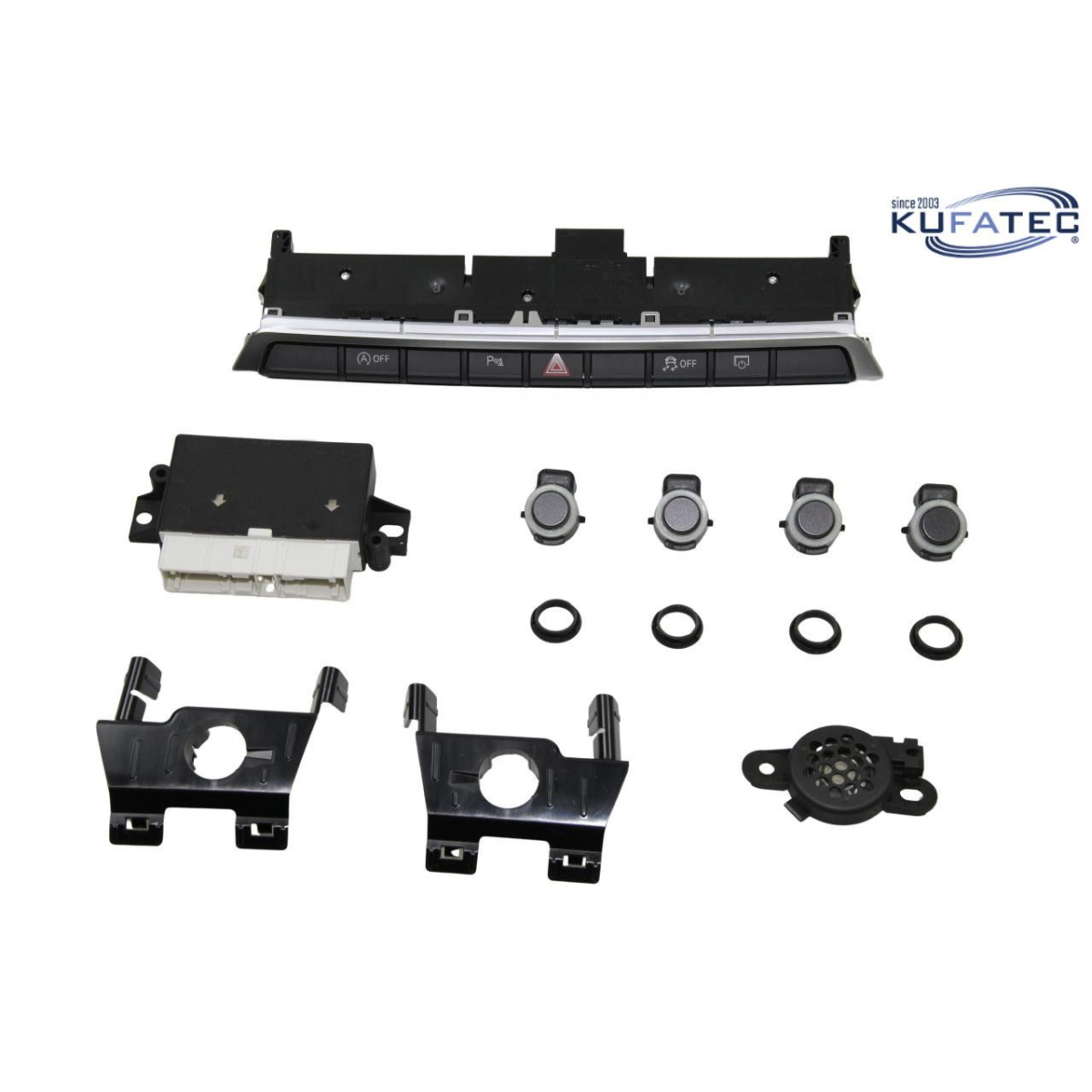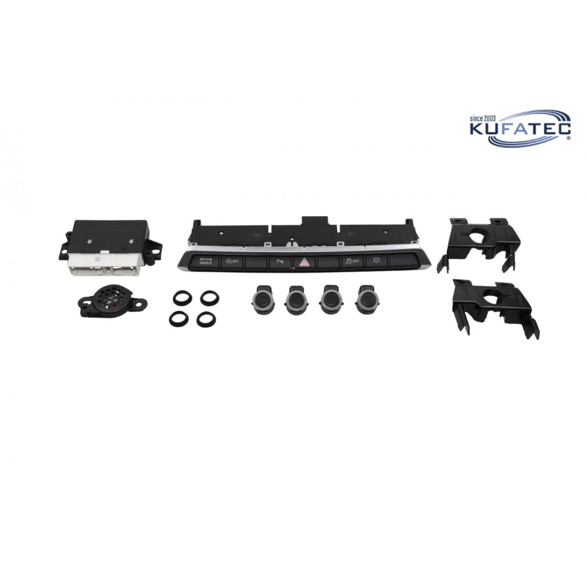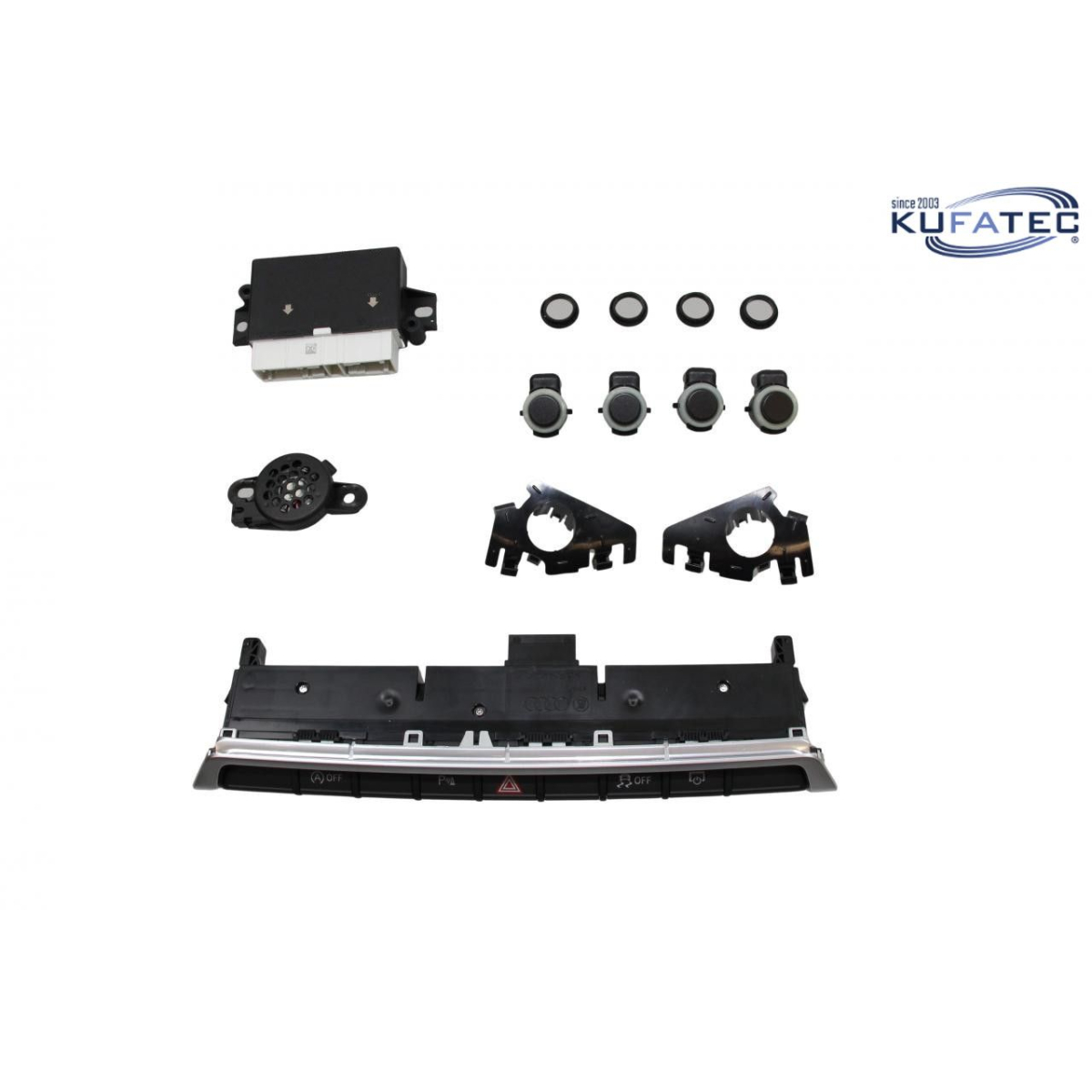 Set completo per l'installazione dei sensori di parcheggio anteriori, con segnalazione acustica della distanza e visualizzazione grafica su monitor di bordo della vettura. Solo in combinazione con sensori posteriori installati di fabbrica (PR-7X1).