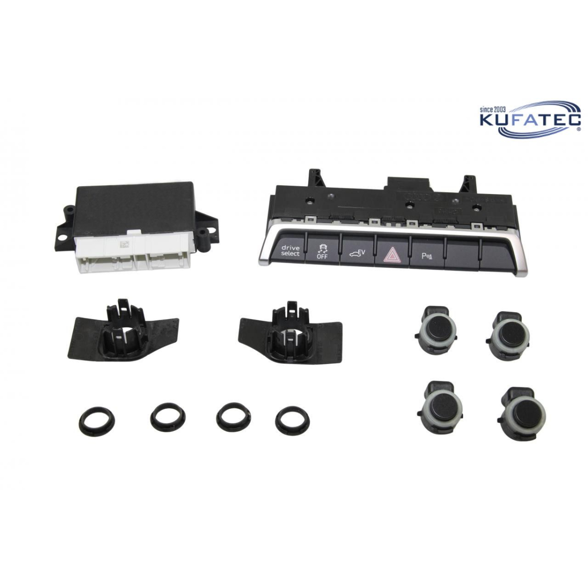 Set completo per l'installazione dei sensori di parcheggio anteriori, con segnalazione acustica della distanza e visualizzazione grafica su monitor di bordo della vettura.