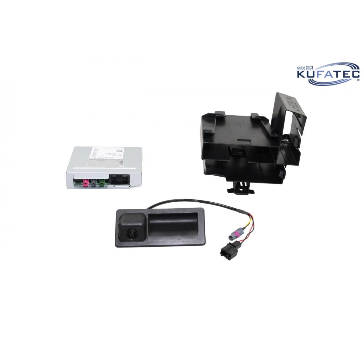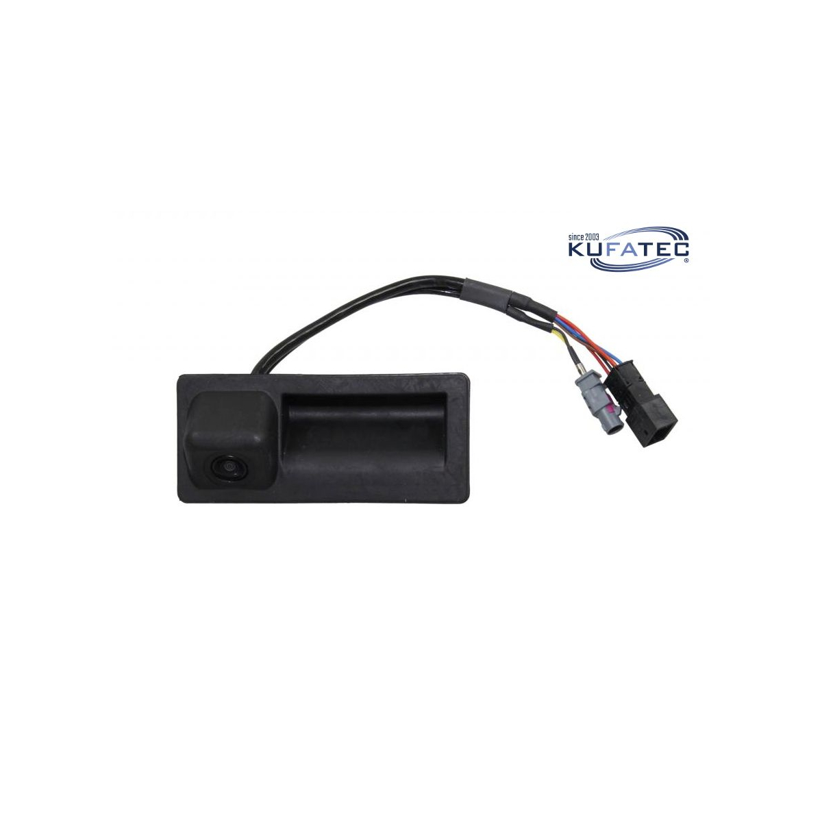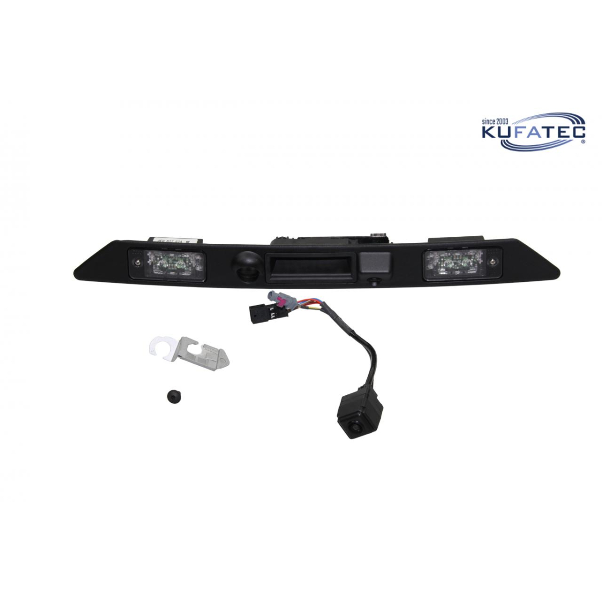 Set completo per l'installazione del sistema di retrocamera originale con linee guida e telecamera integrata nella maniglia vano bagagli.