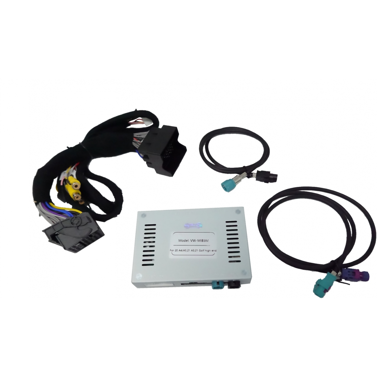 Interfaccia di retrocamera per veicoli VW con sistema di infotainment MIB3 ed in combinazione con monitor da 10". Supporto visualizzazione grafica parcheggio (se presente) e funzione linee guida dinamiche OEM attive.