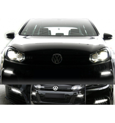 Set completo per l'installazione delle luci diurne LED (installate di fabbrica su versioni R-Line) in VW Golf 6. Paraurti anteriore R-Line non incluso, da ordinare separatamente.