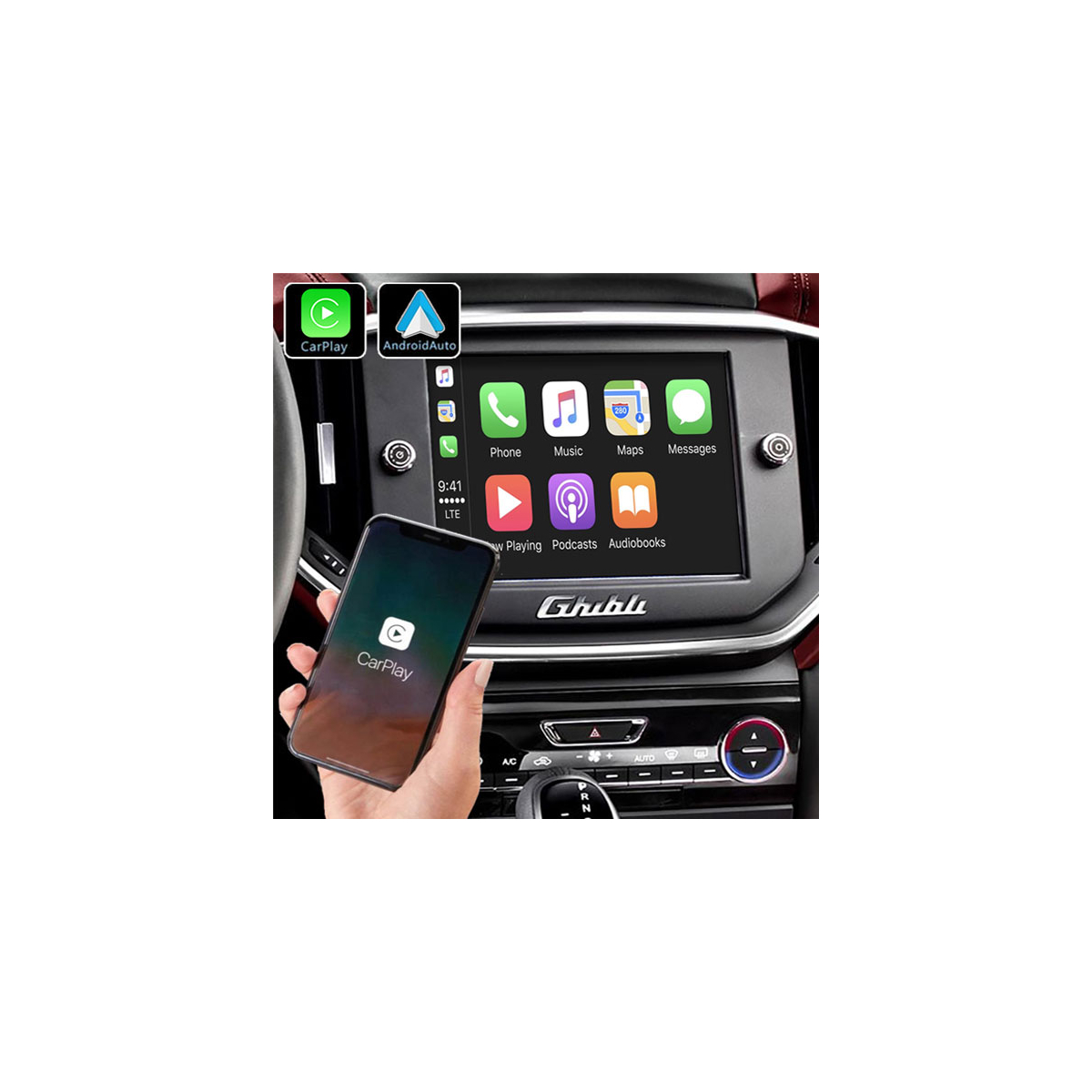 Postmontaggio del sistema CarPlay e Android Auto per vetture Maserati Quattroporte/ Ghibli 2014-2016 con display touchscreen. Ingressi per Rear view camera (linee guida dinamiche e supporto grafica PDC), Front view Camera e USB multimedia playback.