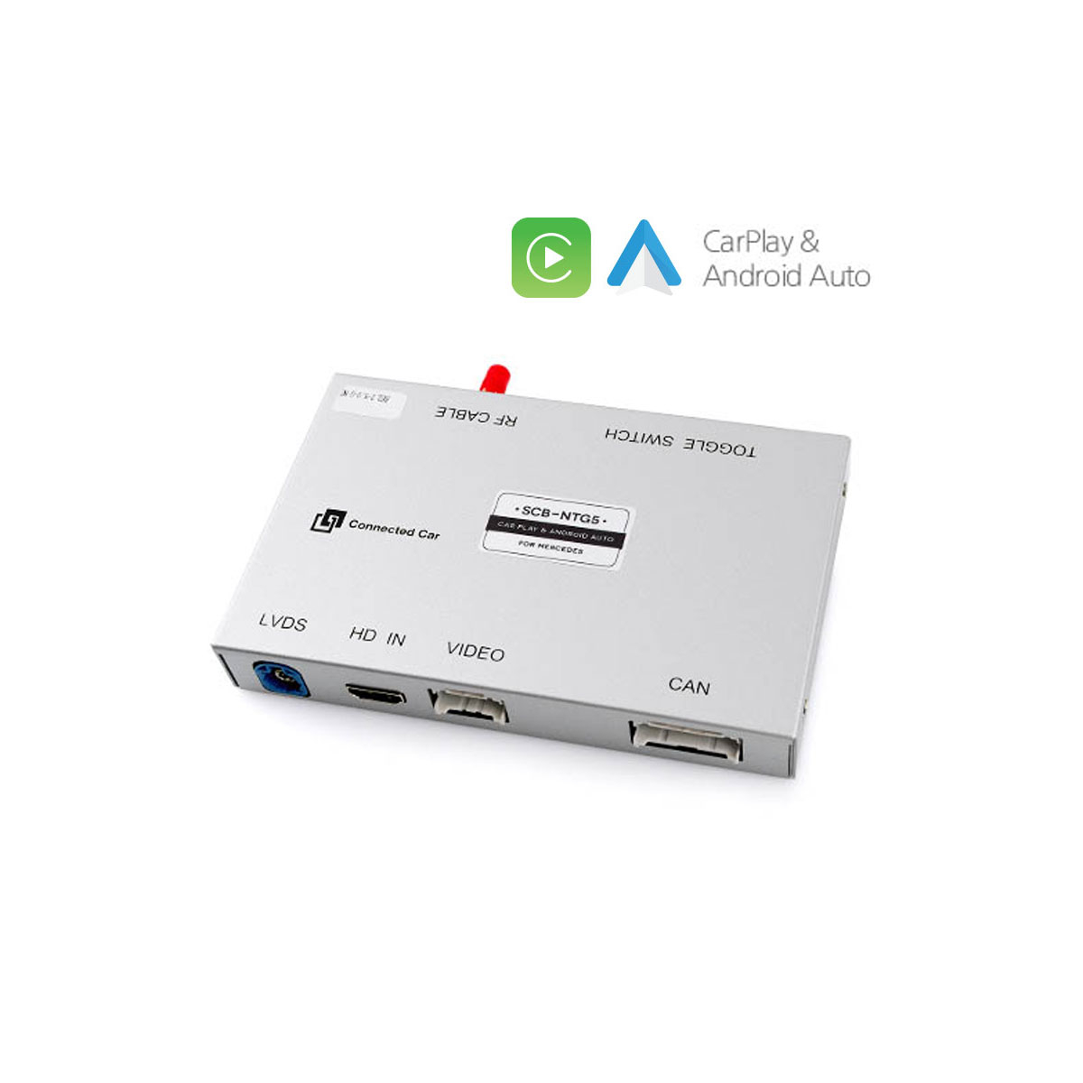Postmontaggio del sistema CarPlay, Android Auto e Mirrorlink per Mercedes NTG 5.0 / 5.1. Ingressi per Rear view camera (linee guida dinamiche e supporto grafica PDC), Front view Camera e USB multimedia playback.