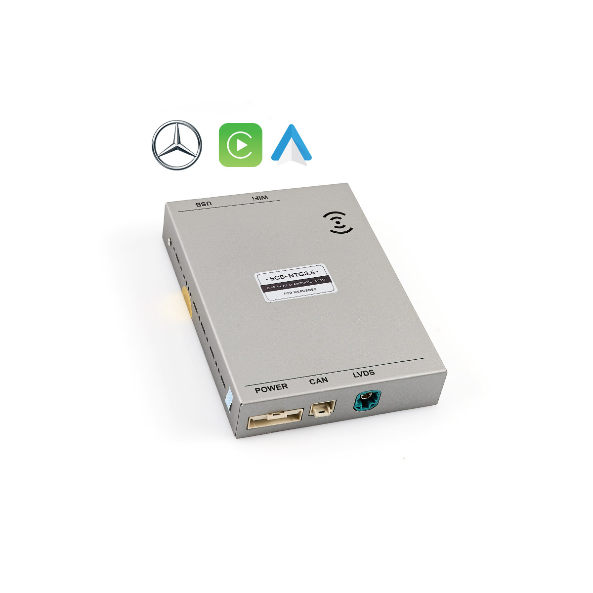 Postmontaggio del sistema CarPlay e Android Auto per Mercedes con sistema NTG6 e display da 7" 10,25". Ingressi per Rear view camera AHD (linee guida dinamiche e supporto grafica PDC), Front view Camera.